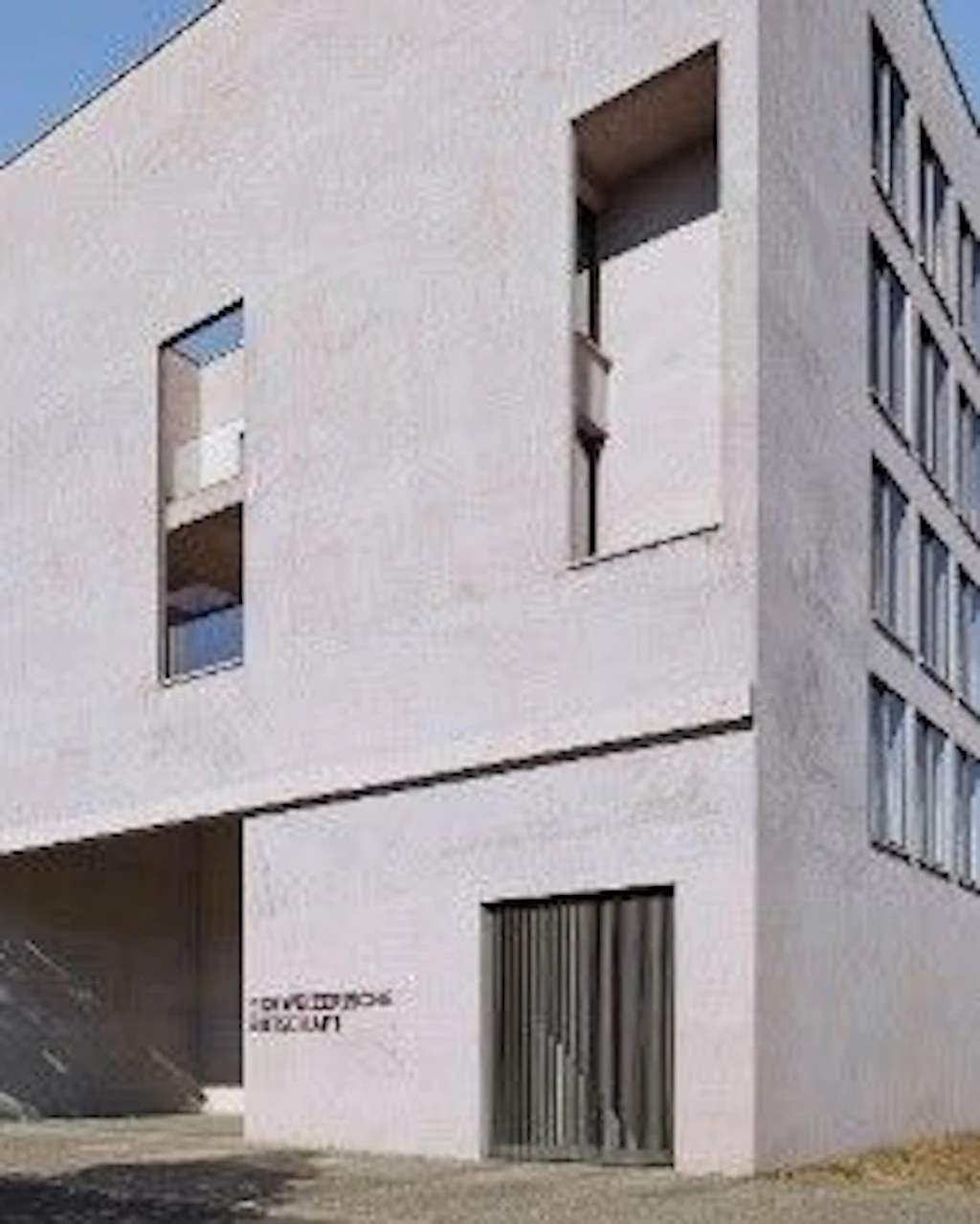 Das Betonrelief auf der Brandmauer der ehemaligen Stadtvilla ist eine durch den Künstler Helmut Federle bearbeitete Fassade.