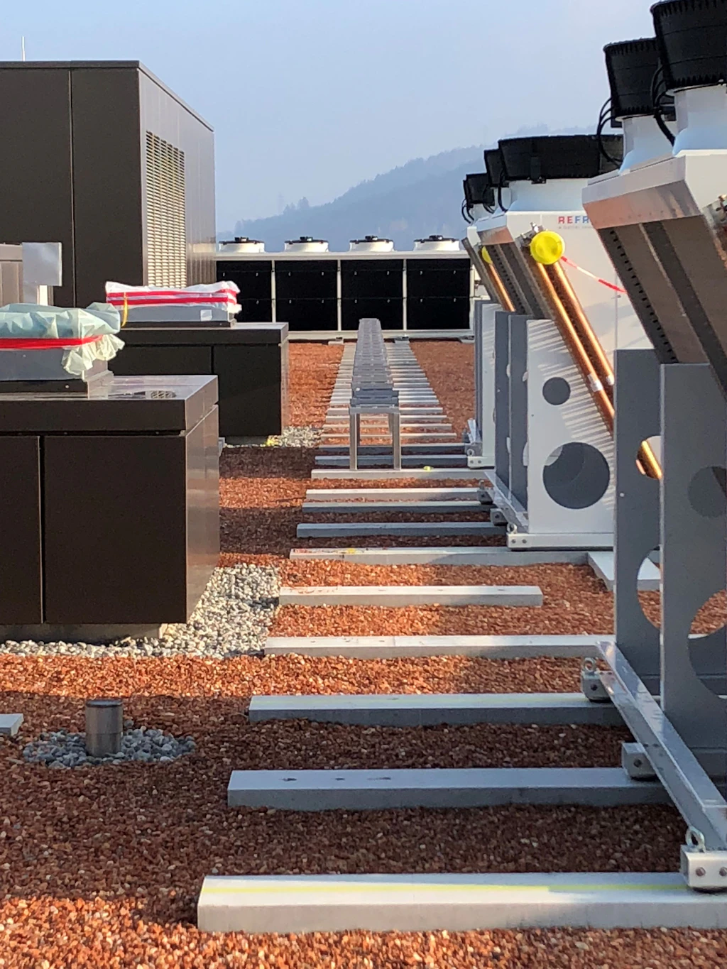Durch die geschickte Anordnung der Techniksysteme fügen sie sich ins Gestaltungkonzept der Gebäude ein und sind quasi unsichtbar.