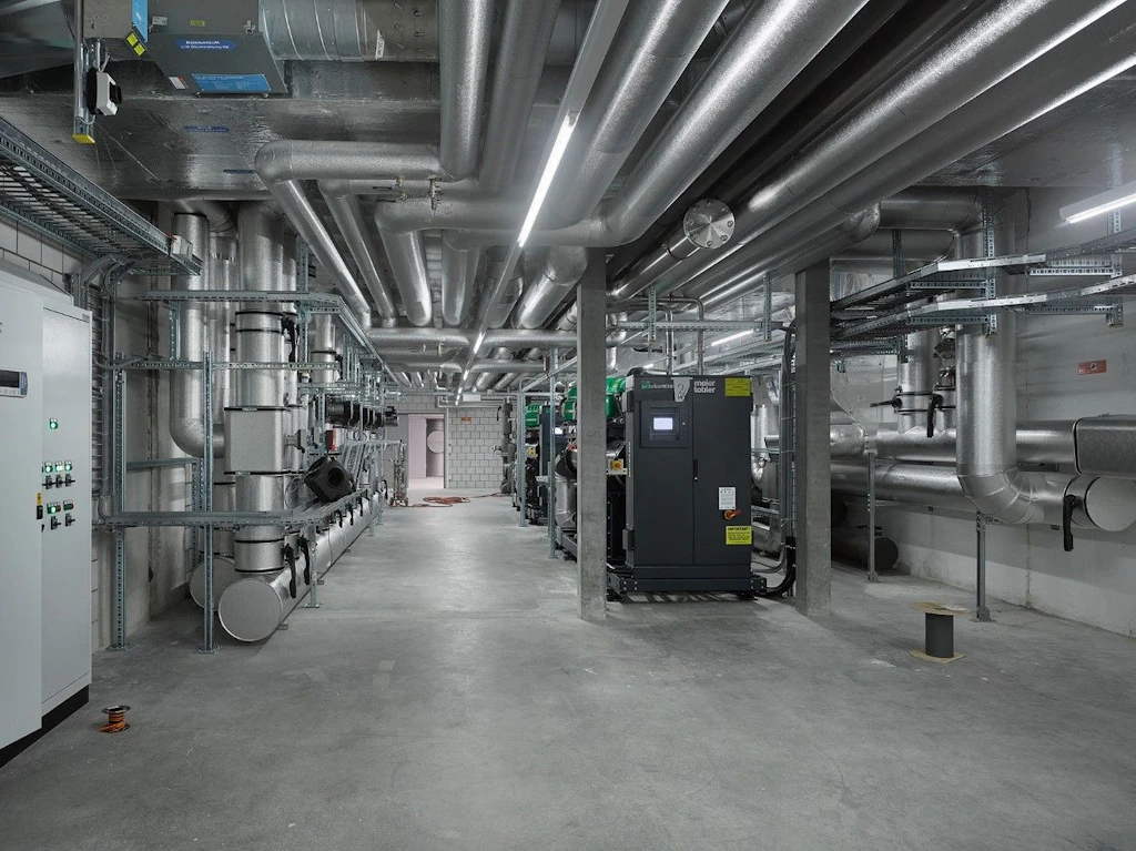Um das hohe Temperaturniveau für die Kühlung der Gebäude zu erreichen und auch im Sommer angenehme Raumtemperaturen zu garantieren, wurden auf den Dächern der Gebäude Kühlwerke installiert. Die Wärmetauscherflächen der Kühlwerke werden zur Effizienzsteigerung mit Regenwasser besprüht - statt wie üblich mit Trinkwasser. Durch dieses Free-Cooling-System kann im Sommer mindestens die Hälfte der benötigten Kühlenergie gedeckt werden. Die restliche Energie wird durch die Erdsonden und die Aktivierung von Energiepfählen gewonnen. Diese Energiepfähle haben eine Doppelfunktion; sie dienen sowohl als Erdwärmetauscher als auch der Statik der Gebäude.
