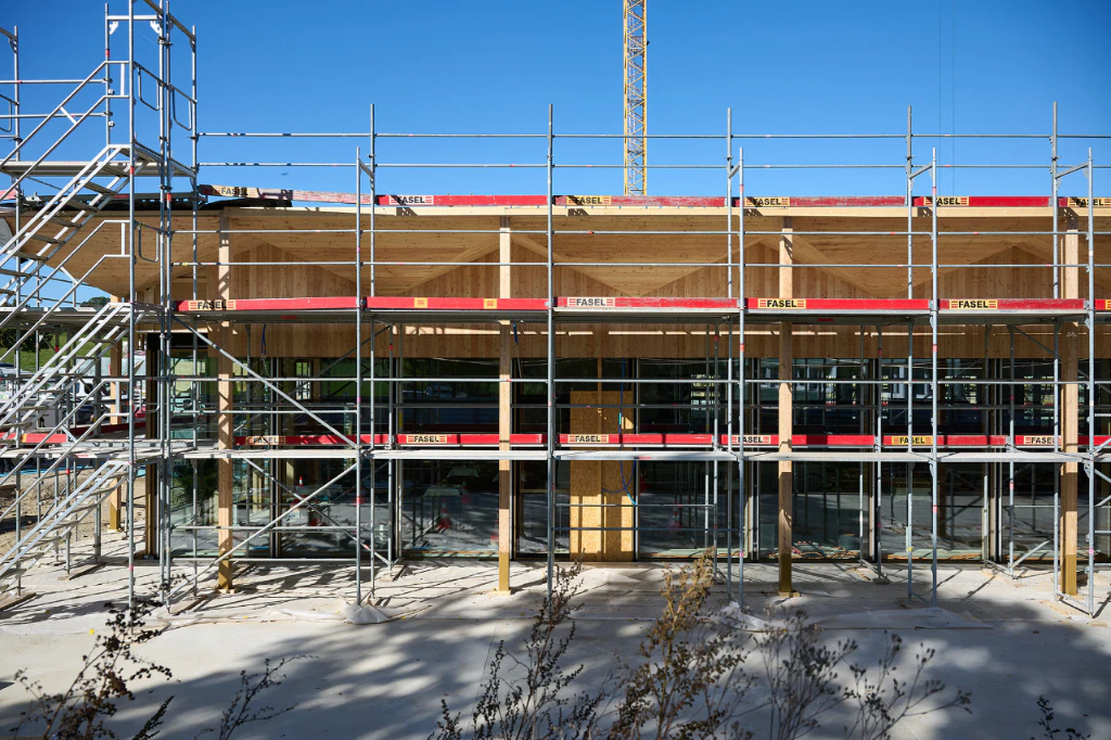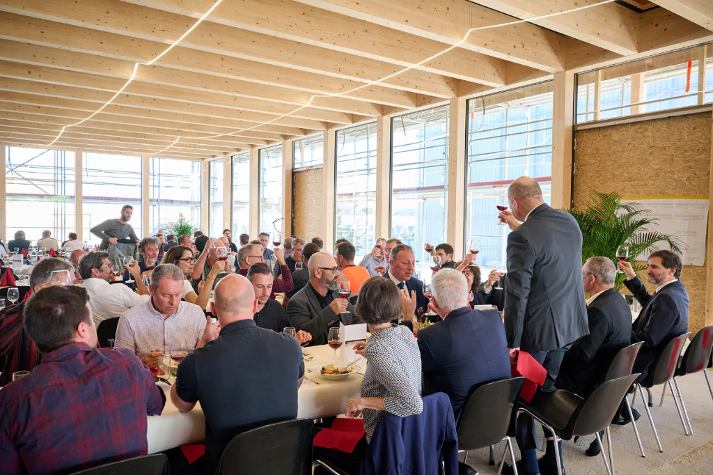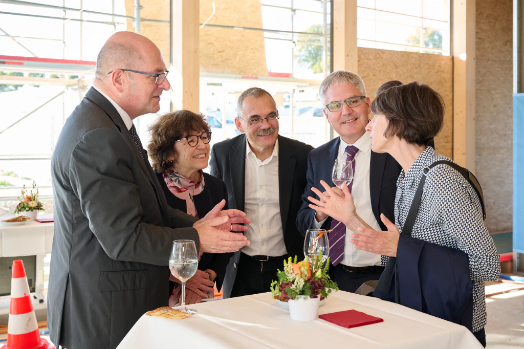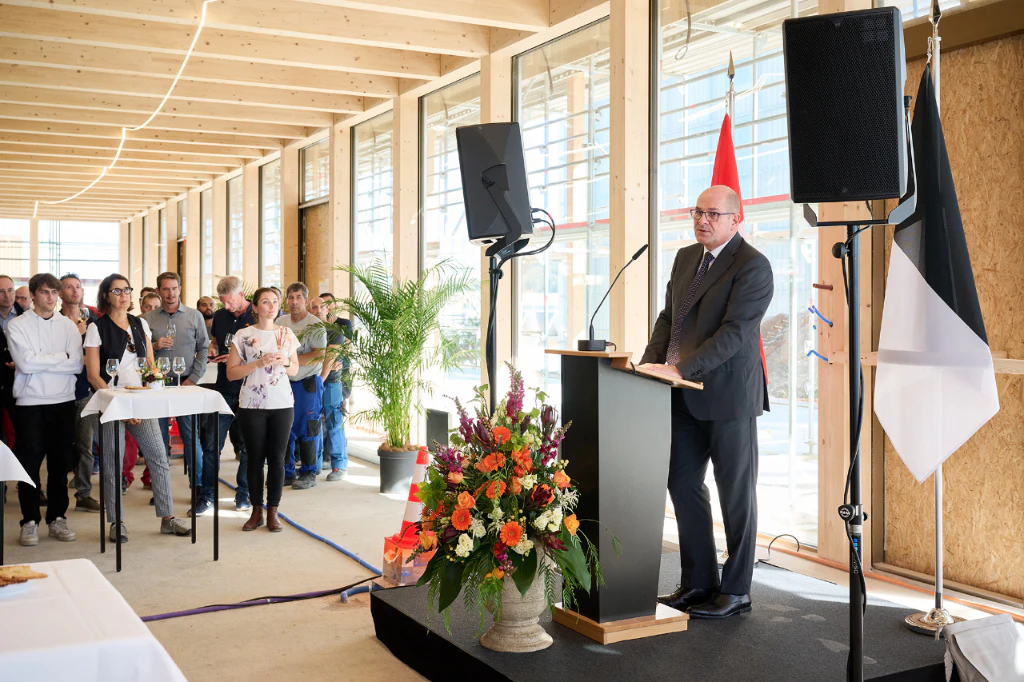 Ein Meilenstein: Richtfest beim Verpflegungs- und Konferenzgebäude auf dem Campus Posieux