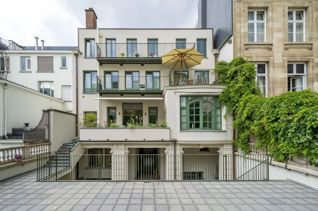 Um die Arbeiten an der zur Strasse ausgerichteten geschützten Fassade so gering wie möglich zu halten, wurden hauptsächlich der Estrich und die rückseitige Fassade gedämmt. So konnte das Dachvolumen intakt bleiben, während die umfassenden Fassadenarbeiten auf der Rückseite die Energieeffizienz der Residenz wesentlich verbessert und gleichzeitig dazu beigetragen haben, den Anblick der über die Jahre immer wieder veränderten Fassade zu vereinheitlichen. Mit ihren zahlreichen Öffnungen und Fluchtbalkonen bietet sie den Bewohnerinnen und Bewohnern einen ganz neuen Komfort und gewährleistet die gemäss Sicherheitsvorschriften notwendigen Fluchtwege. Um die Energieeffizienz zu optimieren, wurde eine kontrollierte Belüftung in Kombination mit einer Sonde eingebaut, die eine für den Erhalt der Goldledertapeten angemessene Luftfeuchtigkeit sicherstellt.