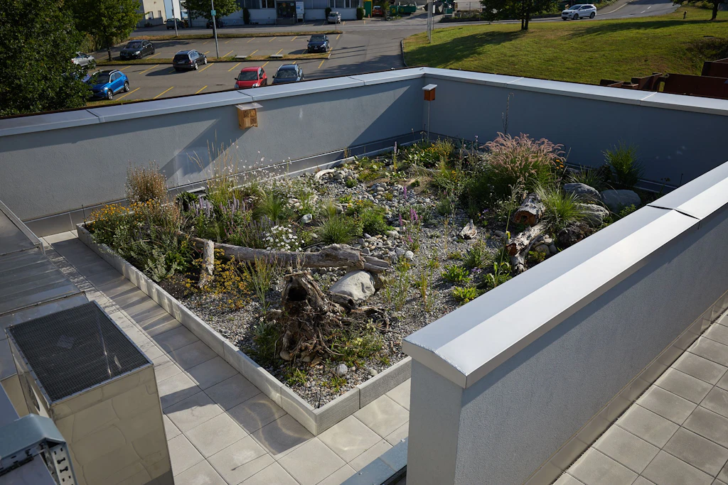 Generell gibt es bei heutigen Sanierungsprojekten neben der Herkulesaufgabe einer Umstellung auf erneuerbare Energie zusätzlich die Herausforderung, den Rückgang der Biodiversität zu bremsen. Es gilt, ganzheitliche Ansätze zu finden und durch die Kombination von biodiverser Dachbegrünung und PV-Anlagen zwei Probleme gleichzeitig zu lösen. Auf dem Dach des Sammlungszentrums ist dies gelungen: Man hat auf insgesamt über 750 Quadratmetern Dachfläche verschiedenste Strukturelemente wie Totholz, Kies- und Sandflächen, Wasserstellen, Nistkästen für Wildbienen, Vögel und Fledermäuse geschaffen. So wurden über 150 verschiedene grossmehrheitlich einheimische Pflanzenarten etabliert, die für Wildbienen und andere Insekten speziell wertvoll sind. So hat man hier einen hoch diversen Lebensraum erschaffen, der schon bald von allerlei Lebewesen besiedelt wird und somit einen wertvollen Beitrag zum Erhalt der Biodiversität leistet.