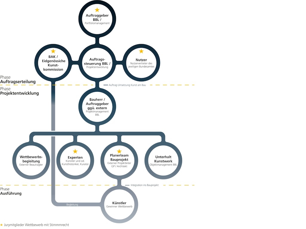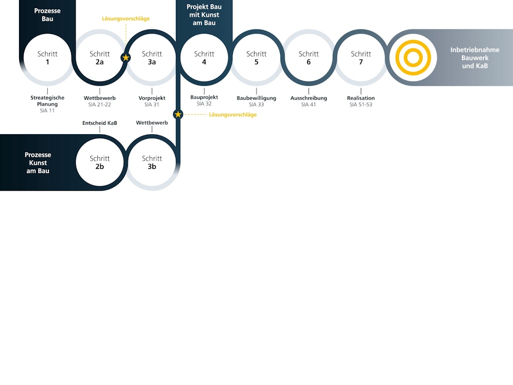 Das Kunst am Bau Projekt wird nach der Phase Vorstudie des Bauprojektes gestartet. Die Auswahl des Kunstwerks erfolgt über einen eingeladenen Wettbewerb, dessen Teilnehmer durch die Eidgenössische Kunst Kommission für jedes auserwählte Bauprojekt festgelegt werden. Für die lokale Bewilligung und Realisation wird das Kunstwerk in die Prozesse des Bauwerks integriert.