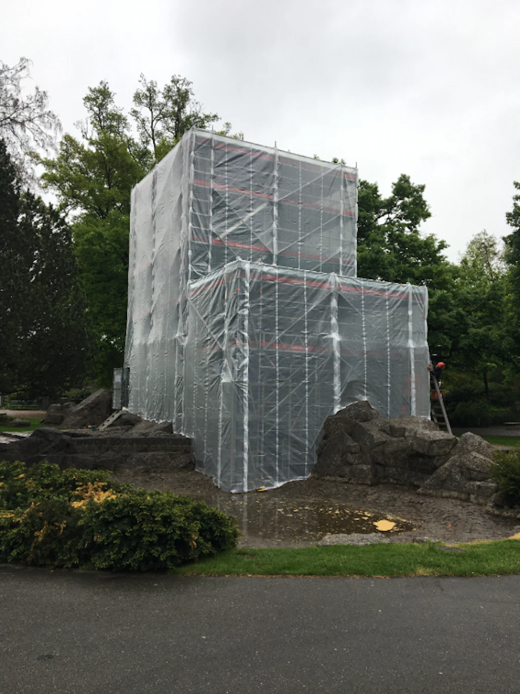 Anschliessend wurde ein neues, nachhaltiges, bisher noch nie auf einer so grossen Fläche (es sind mehr als 100m2) angewendetes Verfahren gewählt: eine Behandlung durch eine Bio-Patina – bei der eine Pilzkultur auf die Metalloberfläche aufgebracht wird, welche diese so beeinflusst, dass die Poren geschlossen werden. Die Pilzkultur ist in einem Gel enthalten, das 10-15 Tage lang in einer mindestens 1 cm dicken Schicht auf der Oberfläche kultiviert wird. Um die klimatischen Verhältnisse zum Wachstum des Pilzes herzustellen, wurde ein Klimazelt um das Denkmal herum errichtet und darin insgesamt 24 Nebeldüsen angebracht. Das sehr schöne und warme Wetter im Monat Juli hat das Wachstum des Pilzes positiv beeinflusst. Als die Oberfläche nach 10 Tagen relativ gleichmässig mit der Pilzkultur überzogen war, wurde das Gel abgeschabt und in Tonnen auf einem Recyclinghof entsorgt. Dieser Müll ist biologisch abbaubar.