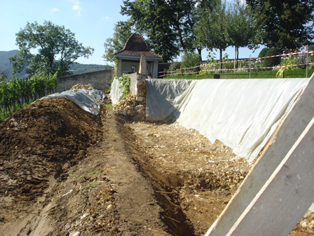 Sanierung der Bruchsteinmauern: Auf dem Burghügel verlaufen vielerlei Bruchsteinmauern entlang der verschiedenen Gärten - dem Gemüseziergarten und dem Rosengarten - sowie entlang den Reben. Diese Mauern zeigen Anzeichen von Verfall und werden im Verlaufe der nächsten drei Jahre instand gesetzt.