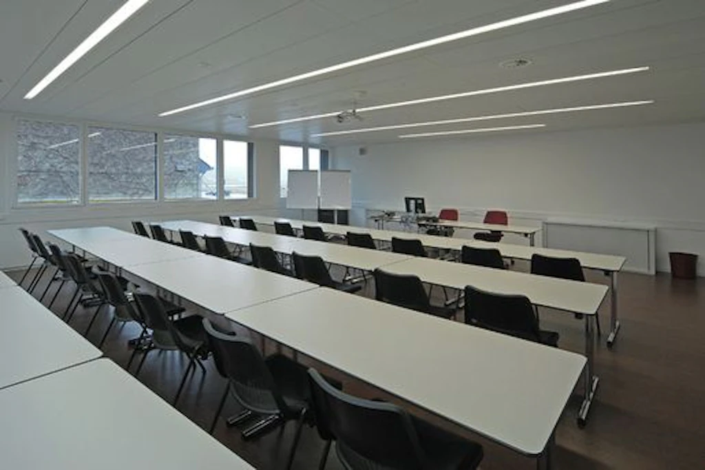 Im Schulungsgebäude sind Theorieräume, Arbeitsplätze sowie eine Cafeteria und mehrere Nebenräume untergebracht. Die Theorieräume sind im Kopfteil des Neubaus übereinander angeordnet und so direkt vom Eingang über die Treppe erschlossen. Direkt neben dem Eingang liegt zudem die Cafeteria, während die Büroräume im Obergeschoss untergebracht sind.