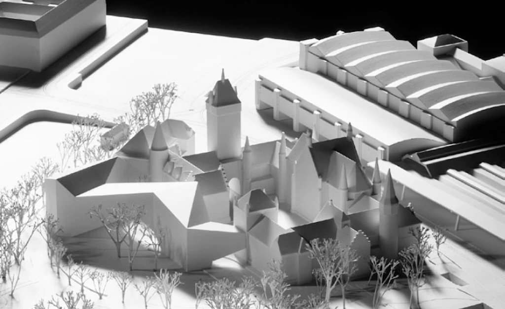 Die bestehende Anlage, eine Figur aus flügelförmigen Gebäudeteilen, bietet die Möglichkeit des Weiterbauens. Der Neubau versteht sich als ein neuer Flügel, der die bestehende Anlage erweitert. Er ist, auch dies in Anlehnung an das bestehende Haus, plastisch geformt. An zwei Stellen verwächst er mit dem Altbau und schliesst so die offene, U-förmige Figur zu einem Ring. Der dadurch neu entstehende Gartenhof erweitert das System von Aussenräumen um einen zusätzlichen Ort. Zudem wird der heute schon bestehende Eingangsplatz aufgewertet, weil hier in Zukunft der Haupteingang zum Museum liegt. Durch den Torturm ist er verbunden mit dem Museumshof. Von hier führt der Weg weiter über den neuen Gartenhof zum Platzspitz. Der Weg von der Stadt in den Park macht das Museum zu einem urbanen Ort. Die Kreuzung dieses Weges mit dem Gebäude bildet das zentrale Motiv des Projektes: Die grosse Brücke.