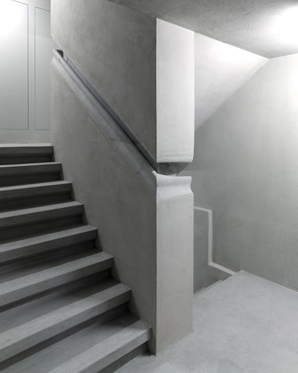 Um die konservatorischen Anforderungen an das Klima erreichen zu können, wurde der gesamte Projektperimeter mit einer Art Doppelfassade ausgerüstet und minimal mechanisch belüftet. Im Brüstungsbereich dieser Kastenfenster sind der Mechanismus eines von unten aufgezogenen Sonnenschutzes, Heizkonvektoren und Quellluftauslässe untergebracht.