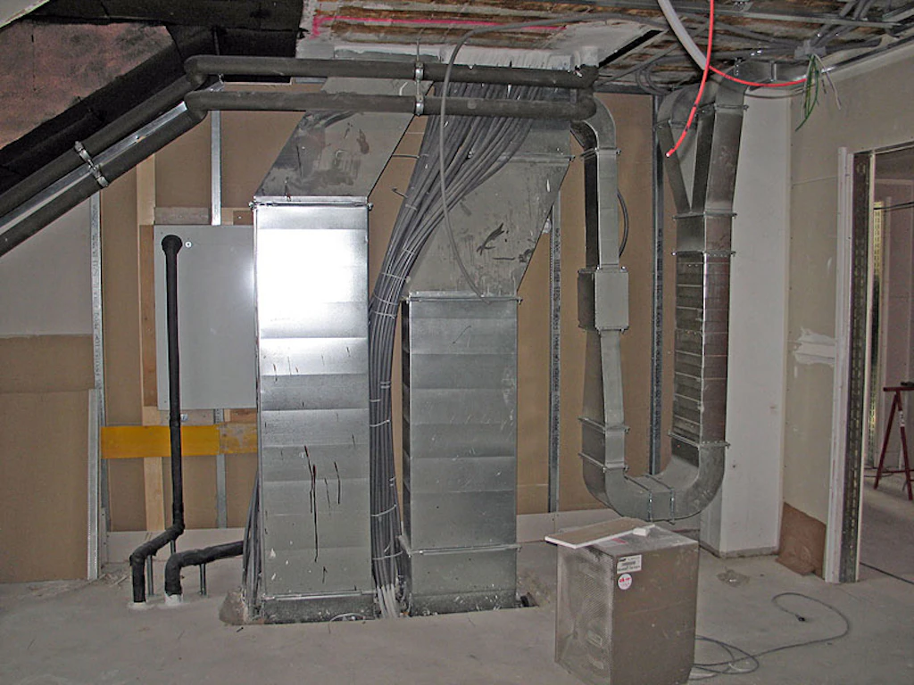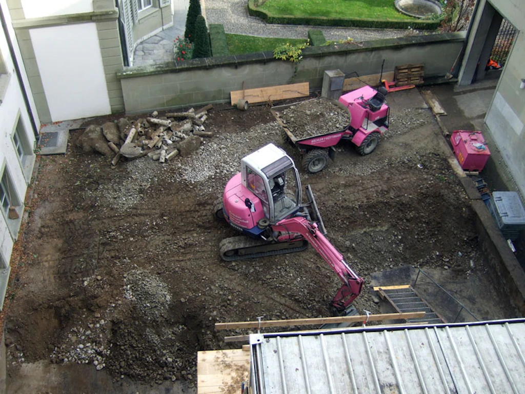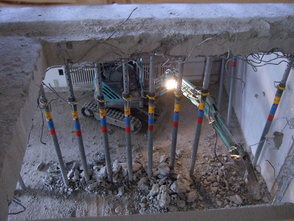 In einer zweiten Phase des Rückbaues erfolgten die gröberen Eingriffe. Die alte Eingangstreppe wurde entfernt und näher beim Eingang neu erstellt. Der Liftschacht für den neuen transparenten Personenaufzug wurde erstellt und auf der Südseite des Haupttraktes wurde ein neues Fluchttreppenhaus eingebaut. Bereits während dieser Phase begannen die Haustechnik - Unternehmer mit den Installationsarbeiten.