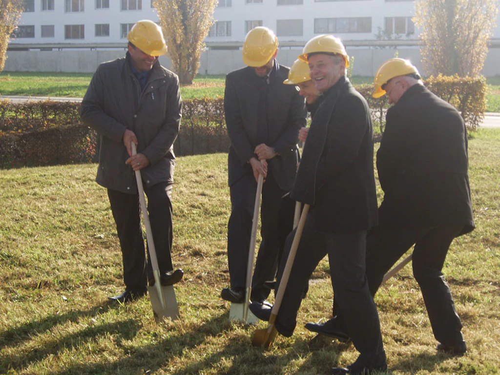 Der Spatenstich fand am 16. November 2011 statt, die Grundsteinlegung erfolgte am 13. Juni 2012 und die Aufrichte konnte am 29. November 2013 gefeiert werden.