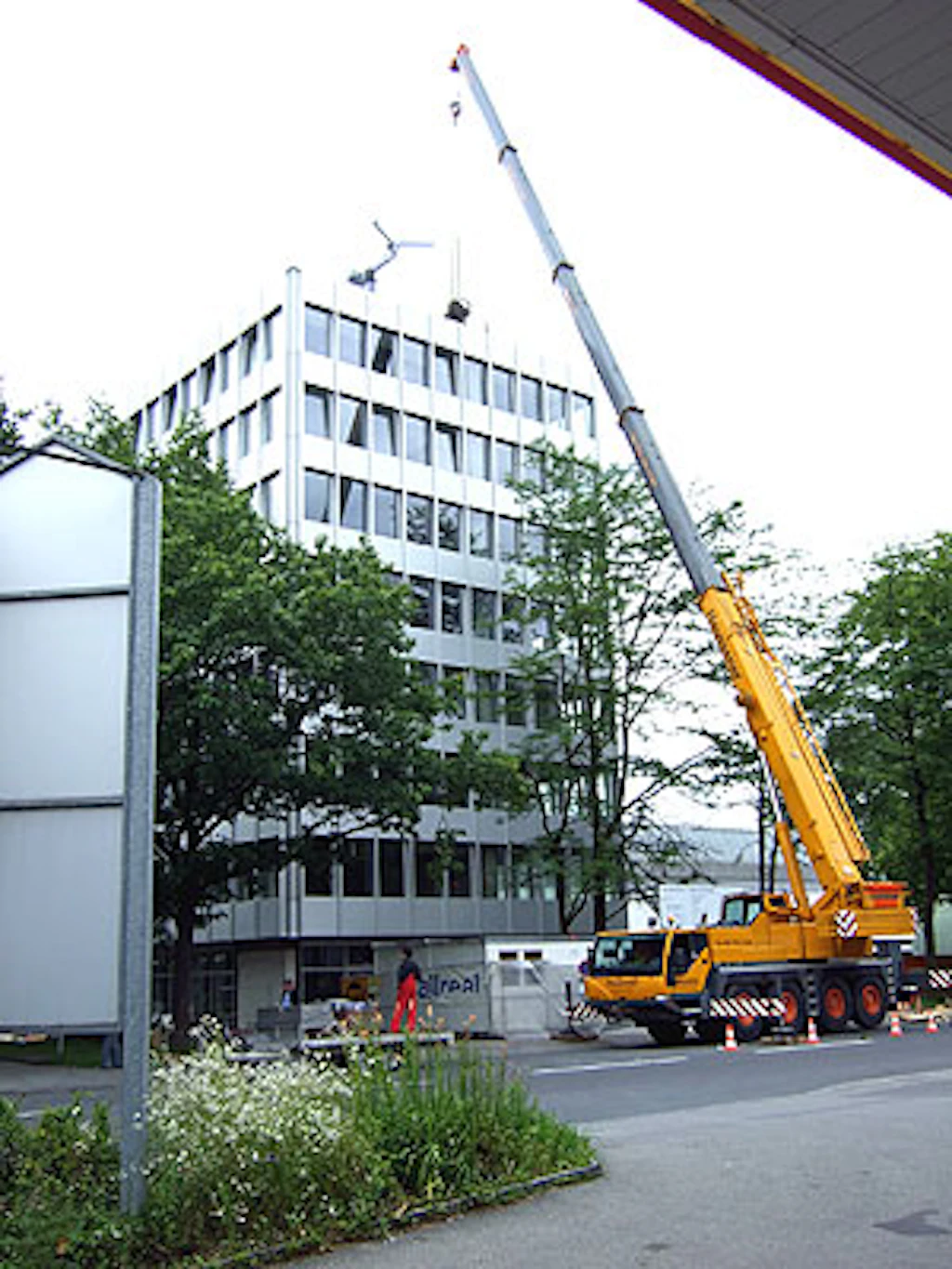 Die Montage der Fassadenelemente wurde Mitte April 2007 abgeschlossen, seither ist die Gebäudehülle dicht. Ende Juni wurde das Attikageschoss in Elementbauweise geliefert. Zur Zeit erfolgen die Montagearbeiten zur Fertigstellung des Attikageschosses sowie die Weiterführung der Haustechnikinstallationen und Innenausbauten.