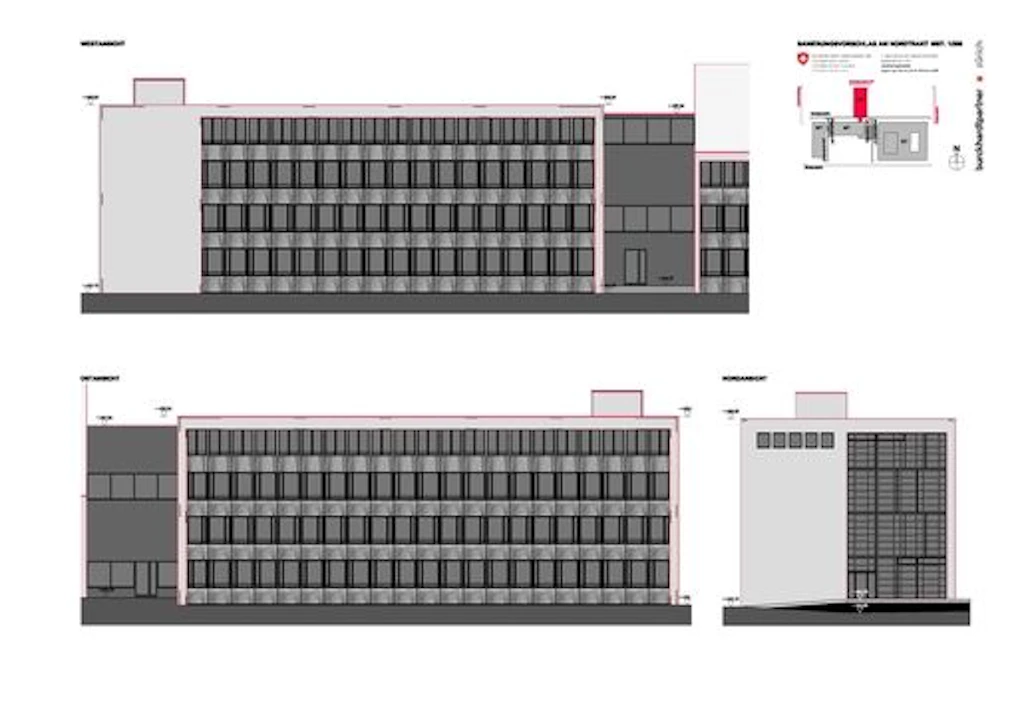 Mit der neuen Gebäudehülle wird die klare kubische Gestaltung und typische Architektur der 60-er Jahre erhalten und der Kontrast zwischen den grossen, geschlossenen Flächen und den eleganten, bandartigen Fensterflächen betont. Das transparente Dachgeschoss auf dem Mitteltrakt und das filigrane Glasvordach beim Haupteingang - zeigen die Charakteristik der angestrebten Neugestaltung auf.