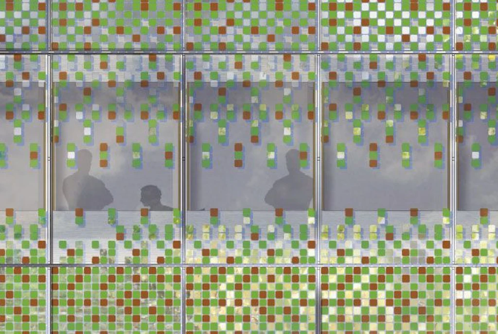 Le bâtiment se caractérise par sa façade double, une «peau» de verre protégeant une façade intérieure isolée en bois et verre fixe. Cette enveloppe extérieure est structurée visuellement par des pastilles de 8 x 8 centimètres qui filtrent la lumière: les pastilles sont colorées en vert olive pour certaines, en orange rouille pour d'autres. Une pastille sur cinq est un miroir, dans lequel se refléteront les vignes alentour avec leur couleur dominante au fil des saisons.