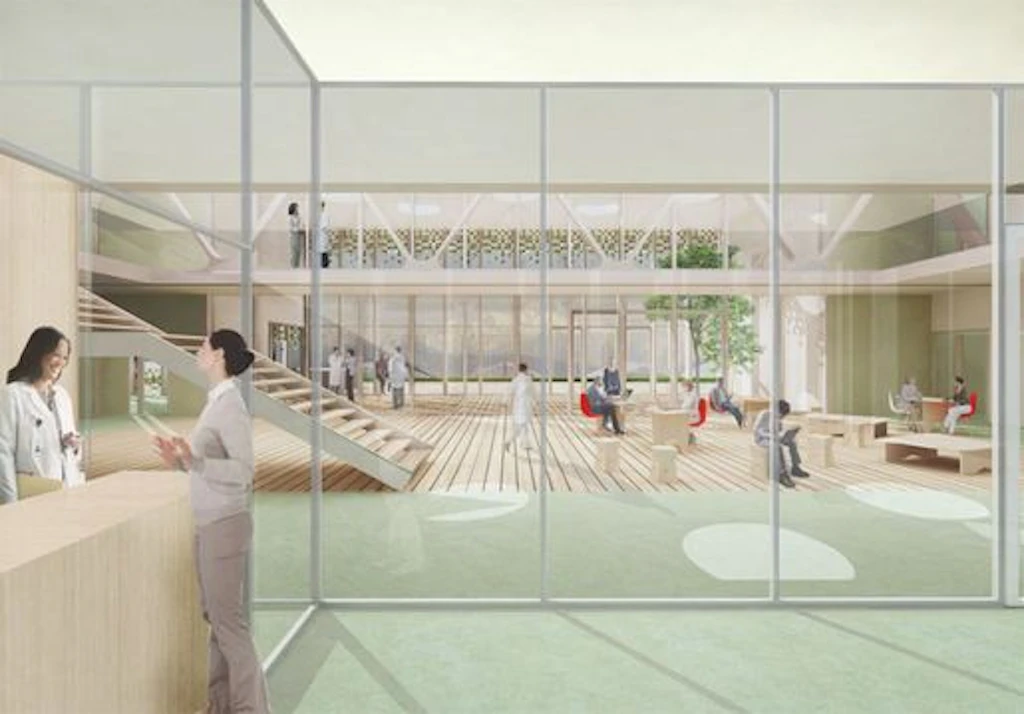 La structure du bâtiment est en béton et celle des façades est en bois. Les éléments porteurs verticaux qui supportent les dalles sont des poteaux et des noyaux en béton ; ces derniers accueillent les circulations verticales, stockages, services et salles de réunion, et jouent par ailleurs un rôle parasismique important. Dans l'espace traversant de l'atrium, la transmission longitudinale des forces est assurée par la structure portante d'une passerelle métallique.
