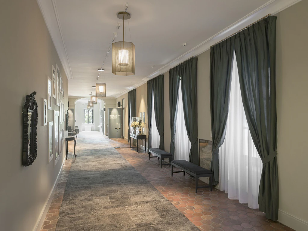 Le long couloir au premier étage où se trouve maintenant notre « Galerie des portraits ». Autrefois, les galeries de château servaient non seulement à relier les ailes au corps de logis central, mais aussi, à la mauvaise saison, de lieu où déambuler et faire sa promenade. On y accrochait souvent des tableaux et des portraits. Grâce à la nouvelle intervention, cet espace a retrouvé sa cohérence spatiale mais aussi l’aspect d’une galerie habitée avec tapis, mobilier, rideaux, lanternes et bien sûr des portraits aux murs.