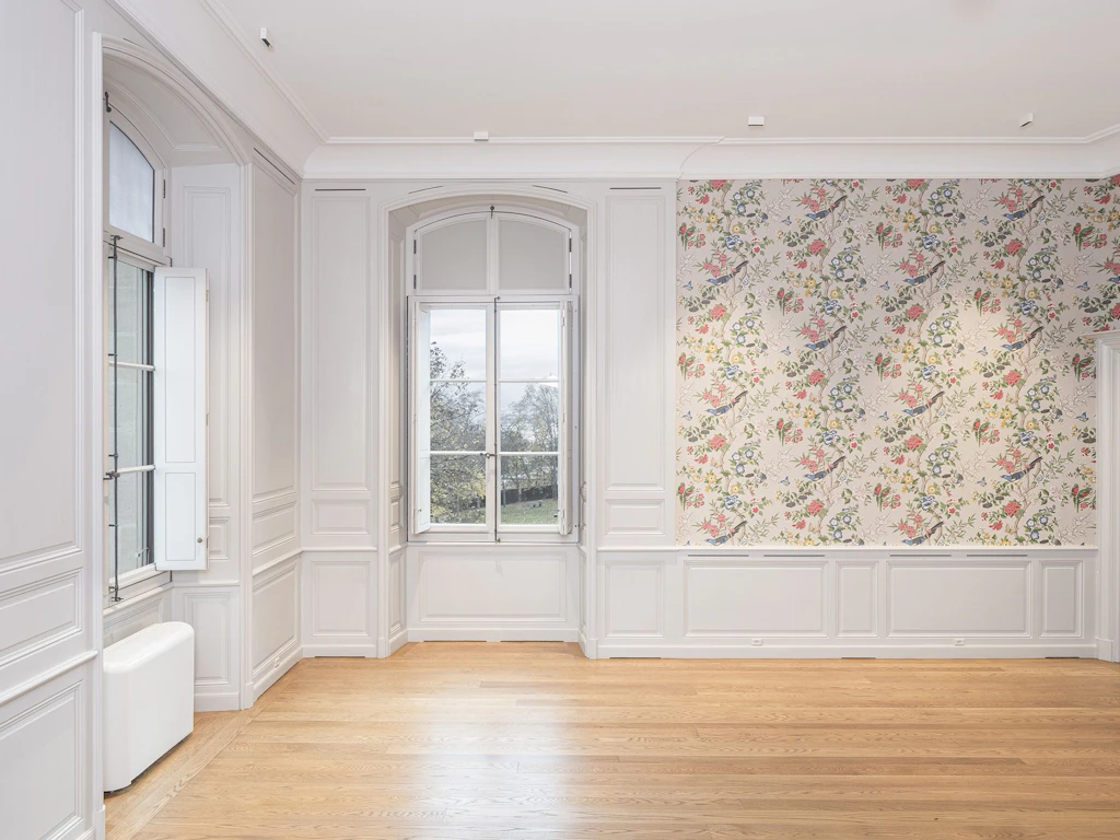 Le travail des architectes (DOM + werkbüro Association d’architectes) pour la rénovation des salles d’exposition permanente s’est fait en collaboration avec les scénographes (Catherine Nussbaumer et Atelier Oï) ainsi que la direction du musée et de l’équipe technique. Les sols, parois et plafonds ont été rafraichis en accord avec chaque concept scénographique. Un nouvel éclairage est venu remplacer les rails existants qui, soigneusement déposés, sont venus compléter la lustrerie existante et conservée dans certaines pièces. L’ensemble des spots a été systématiquement remplacé par du LED pour des raisons de consommation énergétique. En parallèle, les scénographes muséographes ont souhaité laisser entrer la lumière naturelle dans ces nouveaux espaces d’exposition. L’ajout de filtres spéciaux compatibles avec les conditions d’exposition ont été posés sur les fenêtres historiques et ont permis de répondre à cette nouvelle exigence.