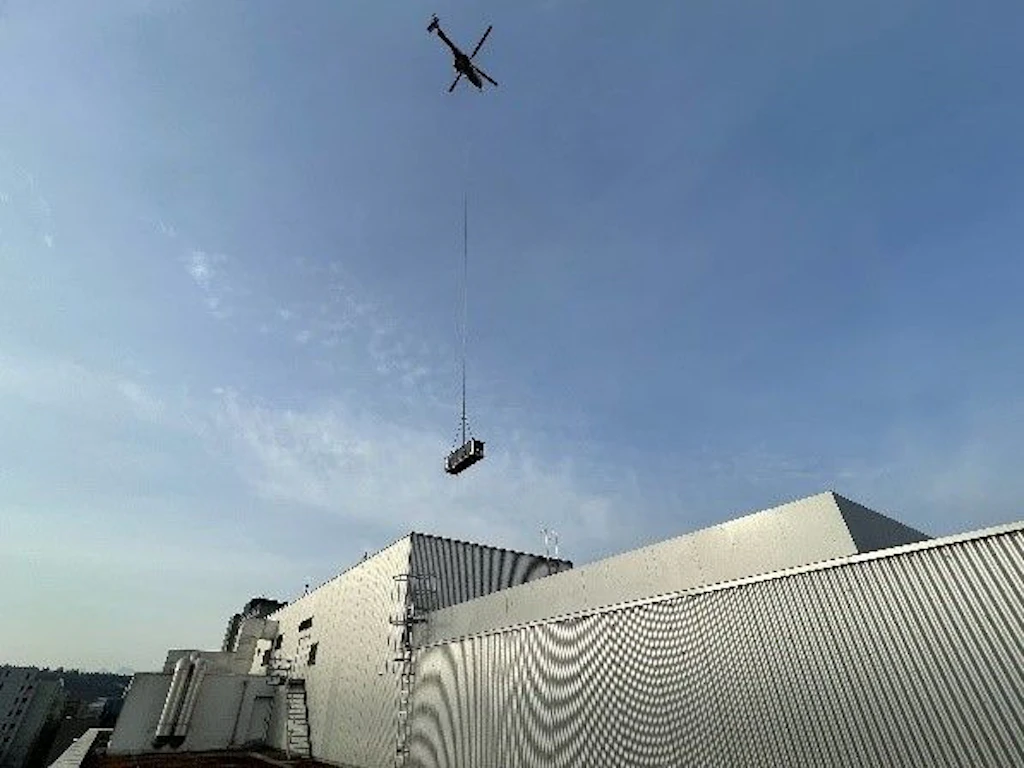 Un hélicoptère a acheminé la nouvelle installation frigorifique de la Fellerstrasse 21