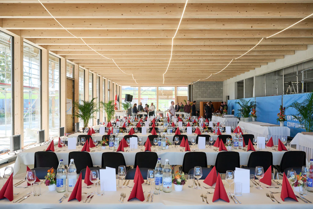 Le centre de restauration et de conférences a été conçu selon les normes du SNBS (Standard Construction durable Suisse) et du label MINERGIE-P-ECO®. Il est optimisé du point de vue économique et tient compte de l’ensemble des coûts du cycle de vie. Le bâtiment sera équipé de capteurs solaires et d'installations de récupération des eaux de pluie. L'énergie utilisée dans le bâtiment proviendra presque entièrement de sources renouvelables.