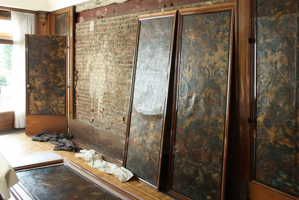 Dix des treize panneaux de cuirs sont alors déposés et leur cadre démonté, avant d’être transportés en atelier. A l’image d’une délicate chirurgie, une restauration minutieuse commence, jalonnée d’étapes très précises. Détaché de son support en bois, le cuir peut être réparé aux endroits des déchirures. Des pièces de cuir de conservation sont coupées, amincies et teintes afin d’être collées au verso des déchirures. De manière à renforcer les panneaux, les cuirs sont doublés de deux couches de papier japonais imbibées de colle réversible à l’amidon. Une fois les retouches nécessaires à l’aquarelle effectuées sur les matériaux ajoutés, les cuirs peuvent finalement être remontés sur les panneaux en bois pour enfin réintégrer la salle à manger de la résidence.