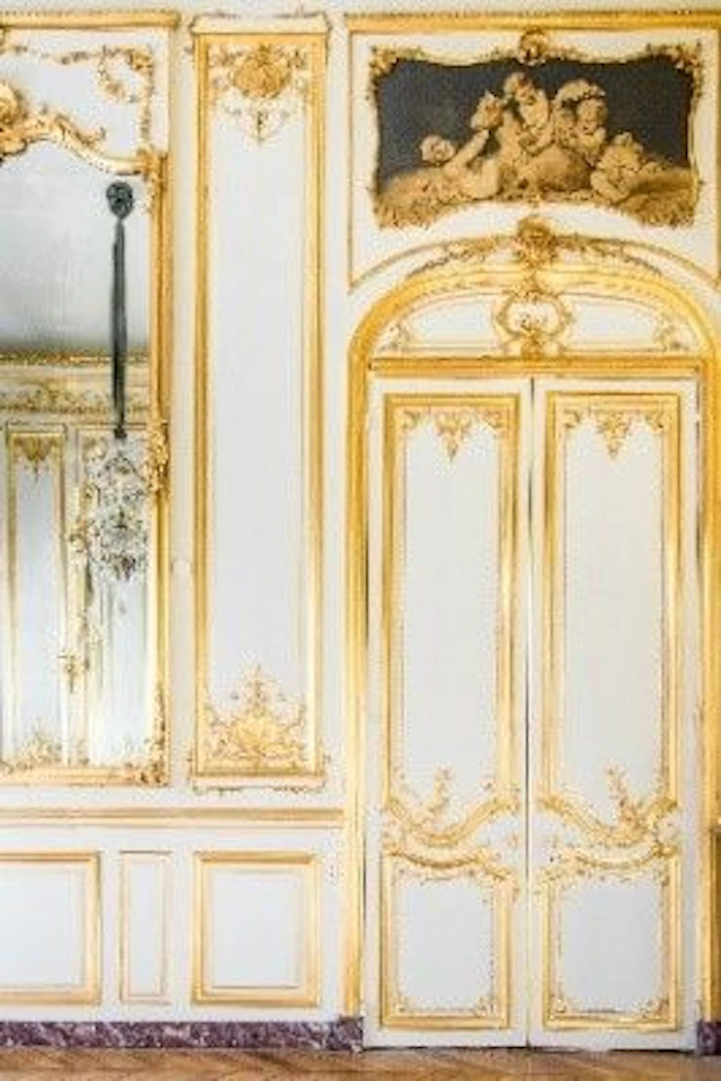 Oggi nell’alcova gli specchi al mercurio moltiplicano motivi e dorature, mentre le stoffe sono completate da passamanerie decorative (frange, nastri e merletti); dentro le bacheche, foderate di frange e raso, compare la collezione di statue in porcellana «Biscuit de Sèvres».
