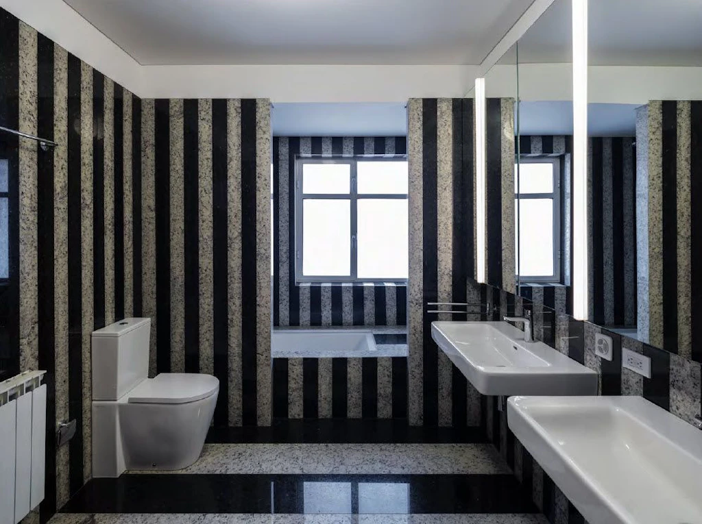 In tutti i locali principali sono stati realizzati controsoffitti di forma geometrica e di vari colori. La loro funzione era rivestire la struttura del solaio, il cui rinforzo si era reso necessario ai fini dell’adeguamento sismico. I controsoffitti colorati uniscono l’idea della modanatura classica alla sensibilità della scultura contemporanea. La struttura spaziale della villa, nella quale si intrecciano lo stile classico e quello moderno, è stata reinterpretata. I colori e la forma dei soffitti sono stati abbinati alle proporzioni dei locali, alla luminosità e alle posizioni degli infissi. Il risultato è un concatenamento armonico e naturale tra gli interni della residenza e il giardino. Il piano terra aperto al pubblico è caratterizzato da colori vivaci, mentre nelle stanze private situate al primo piano prevalgono delicati toni di blu e grigio. I bagni, le cucine e buona parte dell’impiantistica sono stati rinnovati di conseguenza.