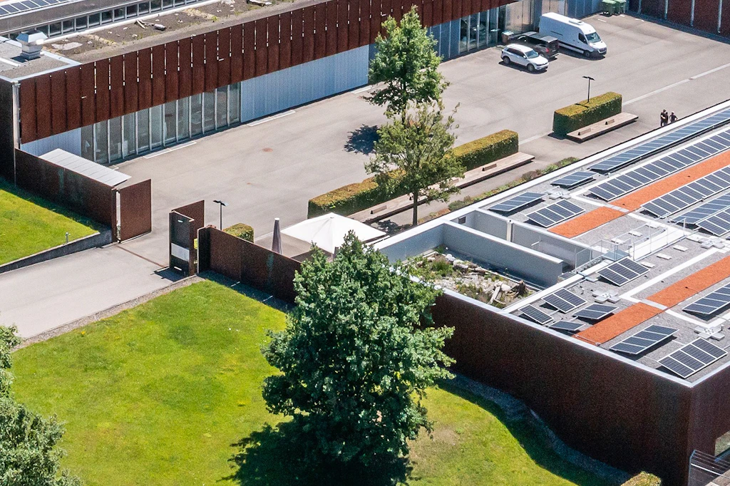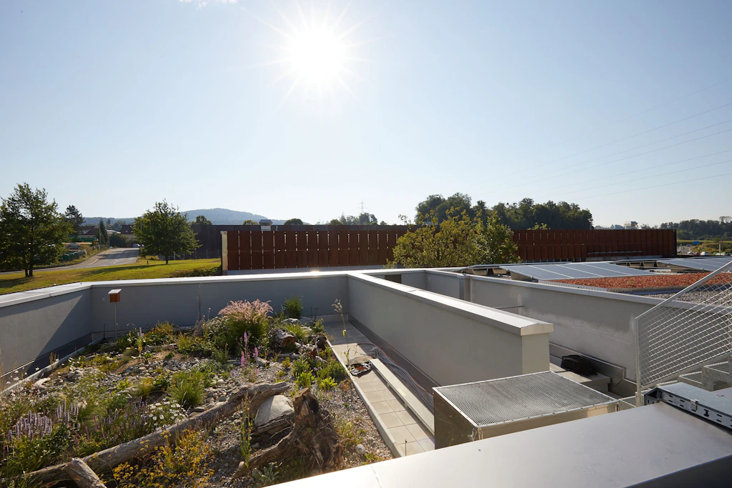 Il Centro delle collezioni del Museo nazionale svizzero di Affoltern am Albis ospita i laboratori di conservazione e restauro, la logistica, le collezioni e il laboratorio fotografico. Si compone di tre stabili. Sulla superficie principale del tetto (3000 m²) era stato installato un impianto fotovoltaico già nel 2012. Dal 2021 al 2022 si è proceduto al risanamento degli altri due tetti piani e, riutilizzando per quanto possibile il materiale isolante, si è fornito un ulteriore contributo in termini di sostenibilità. Il nuovo manto impermeabilizzante corrisponde alla prima priorità secondo le direttive eco-CCC. Non è invece stato sfruttato appieno il potenziale di sostenibilità delle vecchie membrane bituminose, che in Svizzera vengono incenerite mentre potrebbero essere riciclate al nord della Germania. I tetti piani risanati sono stati muniti di moduli fotovoltaici e coperture vegetali. Ora sono un’oasi per le api selvatiche, gli uccelli e i pipistrelli.